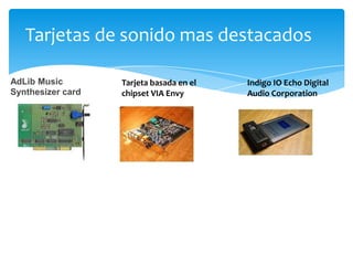 Una tarjeta de sonido es una tarjeta de expansión que permite la salida de audio controlada por un programa. Las tarjetas de sonido más destacadas incluyen AdLib Music Synthesizer card y tarjetas basadas en el chipset VIA Envy. Las tarjetas de sonido pueden proporcionar salida estéreo de 2.0 canales, salida de 5.1 canales tipo Dolby o salida de 7.1 canales. Contienen un chip que convierte el sonido analógico en digital y puede manipular las ondas de sonido.