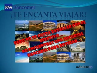 La Tarjeta de Viajes Bancomer es una nueva tarjeta prepagada recargable en pesos mexicanos o dólares estadounidenses que mantiene el saldo en dólares y puede usarse para realizar compras y retiros en cajeros automáticos en el extranjero sin necesidad de cambiar efectivo o cheques de viajero. La tarjeta ofrece disponibilidad inmediata de dinero y puede solicitarse en cualquier sucursal Bancomer para viajar de forma segura y sin complicaciones.