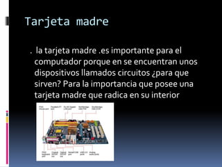 La tarjeta madre es un componente fundamental de una computadora que contiene circuitos y chipsets que permiten la conexión y comunicación de otros componentes como la CPU, memoria RAM y tarjetas de expansión. La tarjeta madre también se le llama placa central y es importante seguir las recomendaciones del fabricante provistas en el manual de instrucciones para evitar errores. Existen diferentes tipos de tarjetas madres clasificadas por su tamaño, como AT, baby AT, ATX y micro ATX.