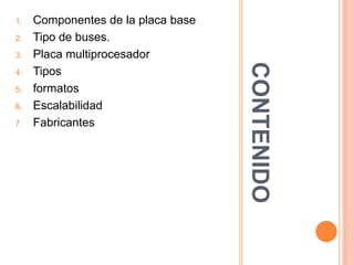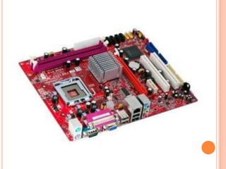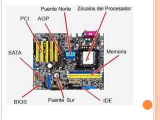 La tarjeta madre es una placa de circuito impreso que conecta los principales componentes de una computadora como el procesador, la memoria RAM y las tarjetas de expansión. Incluye componentes como el chipset, el zócalo del procesador, ranuras para memoria RAM y conectores para periféricos. Existen diferentes tipos de tarjetas madre para procesadores Intel y AMD así como diferentes formatos como ATX, MicroATX e ITX. Las tarjetas madre multiprocesador pueden admitir múltiples procesadores.