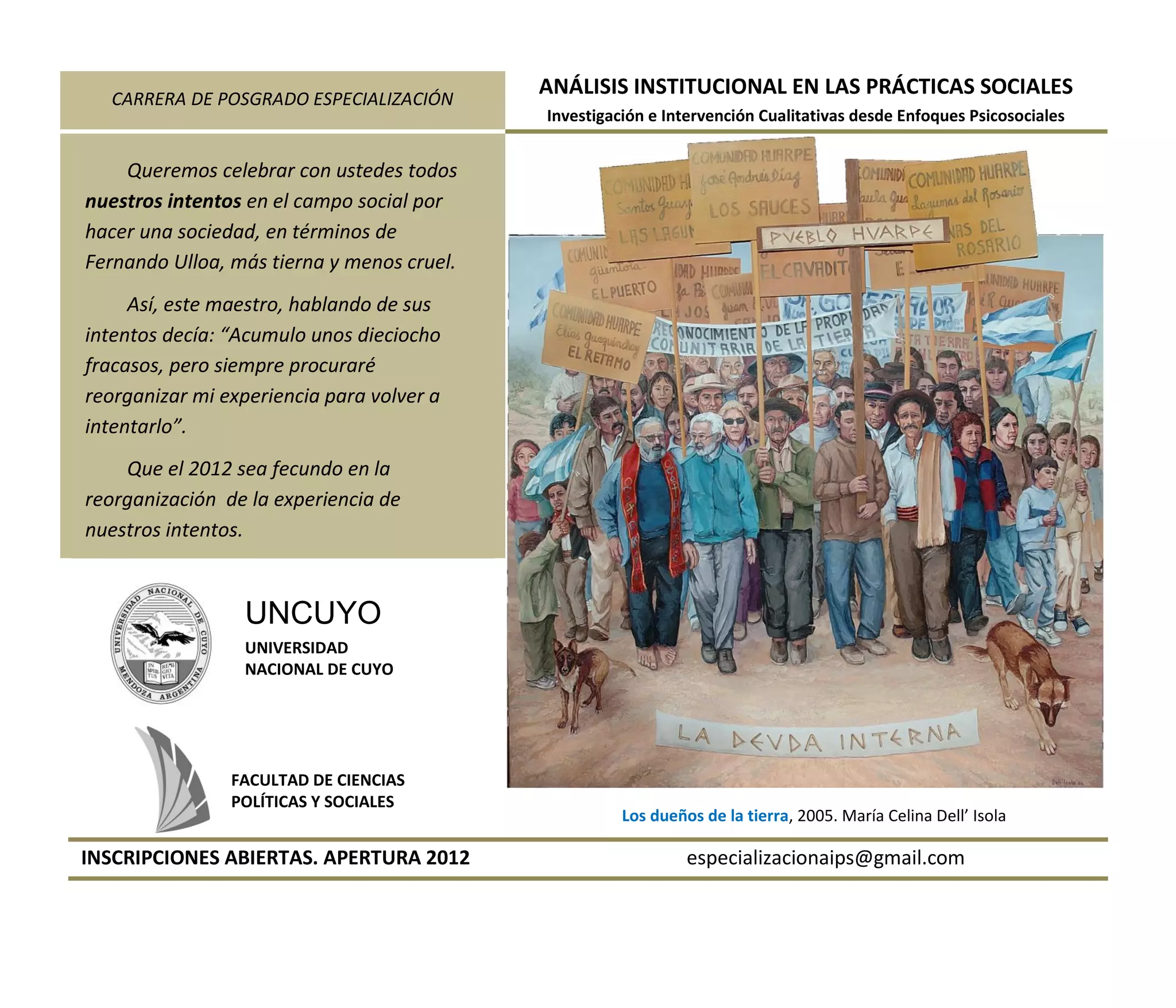 La carrera de posgrado ofrece una especialización en análisis institucional en prácticas sociales desde enfoques psicosociales cualitativos. El documento celebra los intentos por crear una sociedad más justa e invita a reorganizar la experiencia para seguir intentándolo en el nuevo año.