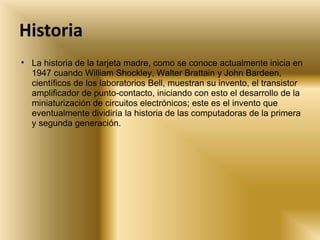 La historia de las tarjetas madres comenzó en 1947 con el invento del transistor. Las primeras tarjetas madres usaban sockets y ranuras ISA y luego PCI e IDE. Las tarjetas madres más recientes incluyen sockets más nuevos, ranuras AGP y PCIe, y puertos USB. Existen diferentes factores de forma como ATX, mini-ATX y NLX. El zócalo LGA 775 se usa para procesadores Pentium 4 y es más resistente que los zócalos con pines.