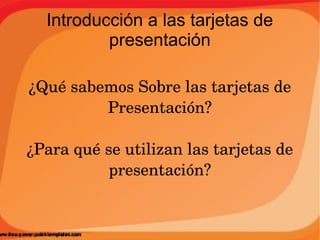 Este documento presenta una unidad sobre tarjetas de presentación, discutiendo su propósito, el proceso de planificación que incluye decidir el diseño, audiencia y contenido, y las etapas de creación y presentación de la tarjeta.