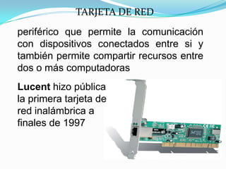 La tarjeta de red es un periférico que permite la comunicación entre dispositivos conectados y compartir recursos entre computadoras. Permite convertir datos a señales para su transmisión por cables e indica su dirección única MAC. Existen tarjetas Ethernet alámbricas, inalámbricas, y de fibra óptica para diferentes velocidades, distancias y movilidad.