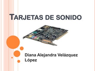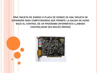 Una tarjeta de sonido es una tarjeta de expansión para computadoras que permite la salida de audio bajo el control de un controlador. Provee la capacidad de reproducir audio para aplicaciones multimedia como videojuegos y edición de video a través de puertos para conectar bocinas, micrófonos y otros dispositivos. Se inserta en las ranuras de expansión de la placa madre y se atornilla para evitar movimiento y fallas.
