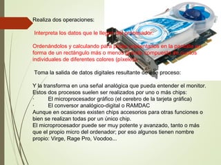 La tarjeta de video procesa los datos de la CPU y los transforma en una señal que puede ser mostrada en un monitor. Realiza dos procesos: interpretar y ordenar los datos de la CPU para mostrar una imagen, y convertir la salida digital en una señal analógica compatible con el monitor. Las tarjetas de video modernas contienen chips como la unidad de procesamiento gráfico y la memoria para lograr altas resoluciones y números de colores.