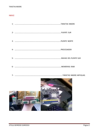 Este documento habla sobre las tarjetas madre y sus componentes principales. Explica que la tarjeta madre está dividida en dos secciones: el puente sur, que controla las tarjetas periféricas como la de video y sonido, y el puente norte, que controla el procesador, la memoria RAM y los dispositivos de almacenamiento. También describe brevemente las tarjetas madre antiguas y cómo han evolucionado para incluir más conexiones periféricas y soporte para mayores capacidades de almacenamiento y procesamiento.