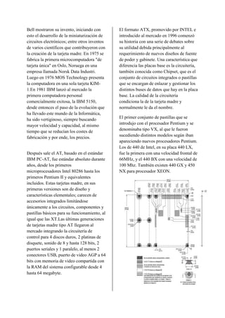 La tarjeta madre es el componente más importante de una computadora, ya que funciona como la plataforma principal que conecta y coordina los otros componentes. A través del tiempo, las tarjetas madres han evolucionado para incluir más funciones y conectores. Actualmente existen varios modelos de tarjetas madres de marcas como Intel, Gigabyte y MSI.