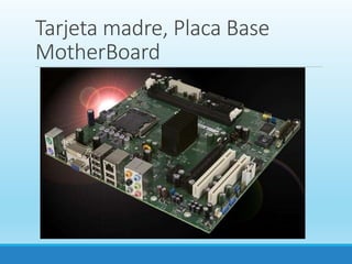 La tarjeta madre es la placa de circuito impreso principal de una computadora que soporta los demás componentes. Contiene el chipset, que conecta el procesador a la memoria RAM, tarjetas de expansión y periféricos. La tarjeta también incluye ranuras como PCI, AGP y sockets que sostienen el procesador y lo conectan a la placa. El BIOS almacenado en la tarjeta inicia y configura los componentes de hardware.