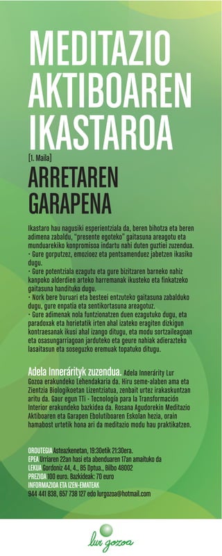 Este curso de meditación activa nivel 1 se enfoca en desarrollar la atención de los participantes. Los estudiantes aprenderán a ser conscientes de su cuerpo, emociones y pensamientos, y a ampliar su capacidad de estar presentes y conectarse con los demás de forma más empática. El curso se llevará a cabo los miércoles desde el 22 de octubre hasta el 17 de diciembre en Bilbao, y estará dirigido por Adela Innerárity.