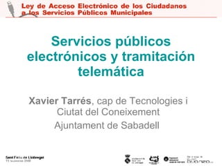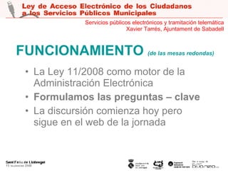 El documento presenta una discusión sobre servicios públicos electrónicos y la tramitación telemática, destacando la ley 11/2008 como impulsora de la administración electrónica. Incluye análisis sobre la evolución de las TIC en diferentes niveles de administración y plantea preguntas clave sobre la planificación estratégica y la necesidad de ofrecer servicios de valor añadido. La jornada incluye mesadas redondas con participación de entidades locales, empresas y asistentes virtuales.