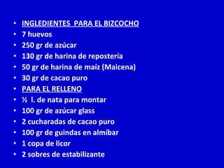 Este documento proporciona instrucciones detalladas para hacer una tarta selva negra en 3 oraciones. Explica cómo preparar el bizcocho con huevos, azúcar y harina, y el relleno de nata, cacao y guindas en almíbar. Luego describe ensamblar la tarta capa a capa con bizcocho embebido en almíbar, nata y cerezas, cubriendo con cacao y chocolate. Finalmente indica que la tarta debe enfriarse varias horas antes de servir.