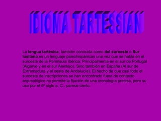 El lenguaje tartésico era un idioma paleohispánico que se hablaba en el suroeste de la Península Ibérica, principalmente en el sur de Portugal y el sur de España, aunque las inscripciones se han encontrado sin contexto arqueológico. Aunque no se puede fijar una cronología precisa, parece que este idioma se usaba desde el siglo V a. C.