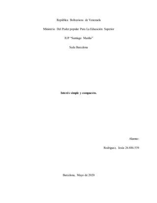 Este documento trata sobre los conceptos de interés simple y compuesto. Explica las fórmulas para calcular el interés en cada caso, así como los elementos que componen cada uno. También define tasas de interés, rendimiento, y describe la equivalencia entre tasas y cómo representarla en un diagrama de flujo de efectivo.