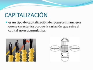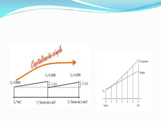 Este documento describe dos tipos de capitalización - capitalización simple y capitalización compuesta. La capitalización simple calcula el interés multiplicando el capital inicial por la tasa de interés, mientras que la capitalización compuesta suma el interés al capital en cada período para obtener un nuevo capital. También define las tasas nominales y efectivas, siendo la tasa efectiva aquella que se calcula para un período determinado.
