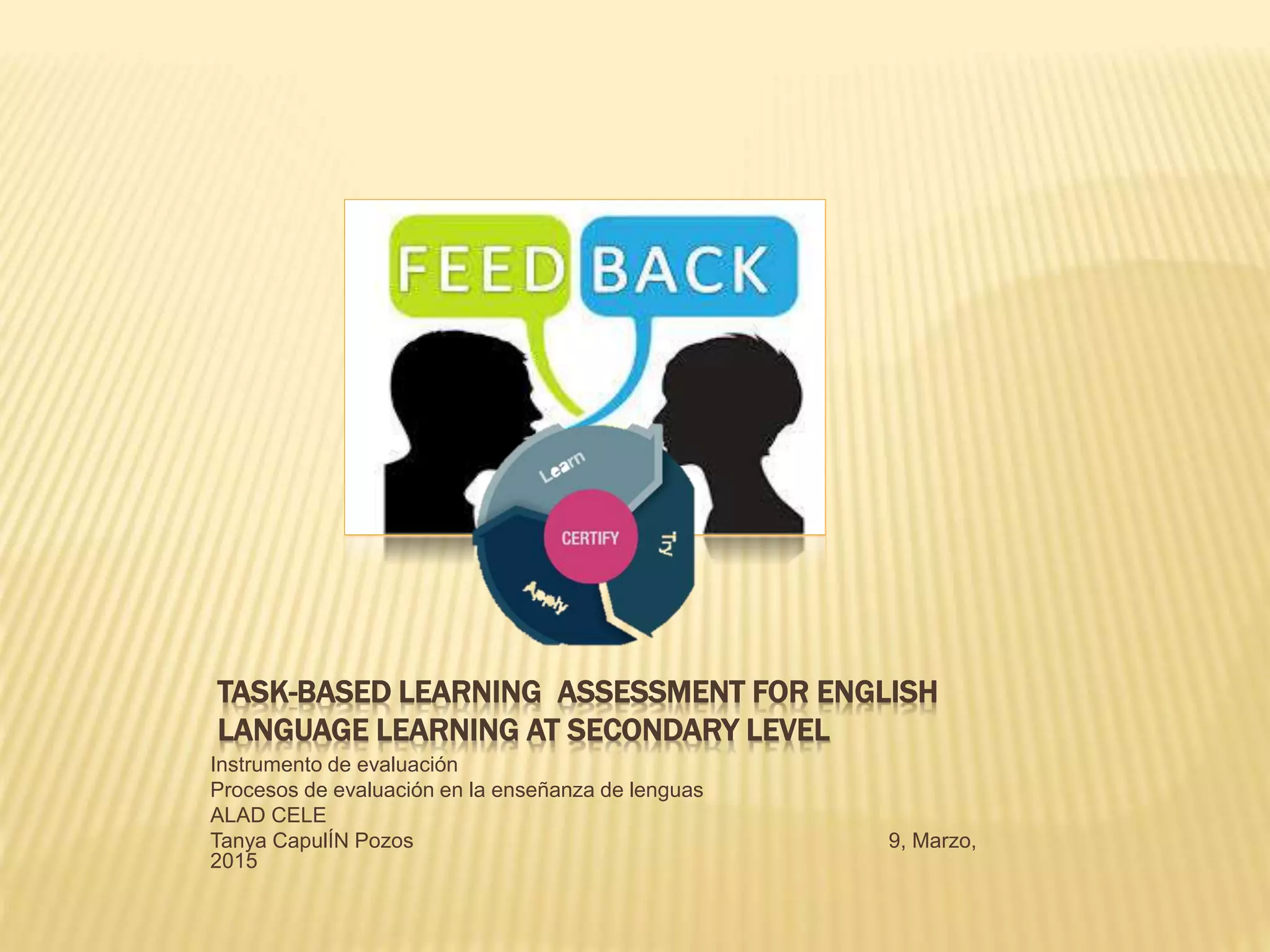 Este documento describe un enfoque de evaluación basado en tareas para el aprendizaje del idioma inglés a nivel secundario. Proporciona instrumentos de evaluación oral e informal para medir la capacidad de los estudiantes para aplicar sus conocimientos de inglés en contextos reales. Estos instrumentos se centran en la producción oral y escrita y utilizan comentarios formativos que consideran aspectos lingüísticos y no lingüísticos para promover la mejora continua tanto de los estudiantes como de los profesores.