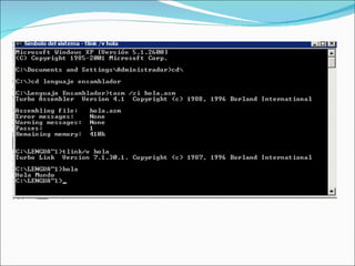 Este documento describe el entorno de programación Turbo Ensamblador. Explica que un ensamblador, editor de texto y enlazador son necesarios para escribir programas en lenguaje ensamblador. Luego describe a TASM, un popular ensamblador para x86, y los pasos para instalarlo, compilar un programa .asm, enlazarlo y ejecutarlo. Concluye que aunque el ensamblador es un lenguaje de bajo nivel, aún es capaz de cumplir con los requisitos de programación de alto nivel.