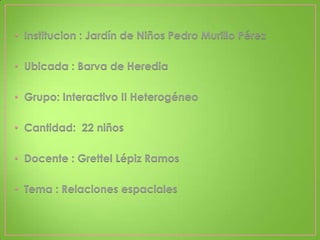 El resumen describe un documento sobre una actividad de reforzamiento en el Jardín de Niños Pedro Murillo Pérez en Barva de Heredia. La actividad involucró a 22 niños del grupo Interactivo II Heterogéneo y se enfocó en enseñar conceptos espaciales como arriba, abajo, adelante, atrás, derecha, izquierda, cerca y lejos a través de una hoja para reforzar los conceptos y ejercicios de educación física. La actividad también incluyó tiempo para la higiene personal, la