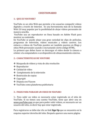 El documento proporciona información sobre YouTube y SlideShare. Explica que YouTube es un sitio web para compartir videos, mientras que SlideShare es un servicio para compartir presentaciones de diapositivas. Luego describe los pasos para publicar un video en YouTube y presentaciones/documentos en SlideShare, incluidos los requisitos de registro y carga. También resume las diferencias clave entre YouTube y SlideShare.