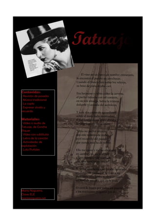 El documento es la letra de la canción "Tatuaje" de Concha Piquer. Narra la historia de un marinero que conoció una mujer en el puerto y se tatuó su nombre en el pecho tras enamorarse. Ella lo olvidó pero él no pudo olvidarla y la busca por todos los puertos con el recuerdo tatuado en su piel.