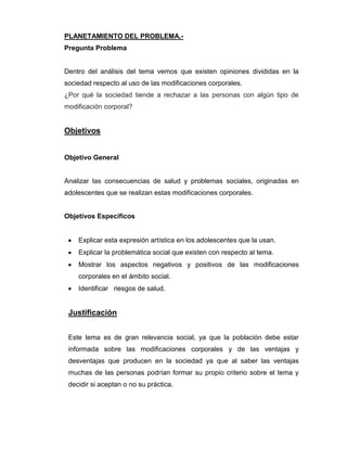 Este documento analiza las modificaciones corporales como una moda entre los jóvenes y las perspectivas negativas que genera en la sociedad. Explica diferentes tipos de modificaciones como tatuajes, incrustaciones y escarificaciones. También discute los riesgos médicos como cáncer y VIH. El objetivo es mostrar las consecuencias de salud y problemas sociales que enfrentan los adolescentes con estas modificaciones y la hipótesis de que la sociedad tiende a rechazarlos.