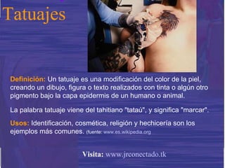 El documento resume la historia y significados culturales y religiosos de los tatuajes a través de diferentes épocas y culturas. La Biblia prohíbe los tatuajes en Levítico 19:28. Aunque los tatuajes son populares hoy, los cristianos deben evitar conformarse a las modas seculares y en su lugar glorificar a Dios con sus cuerpos.