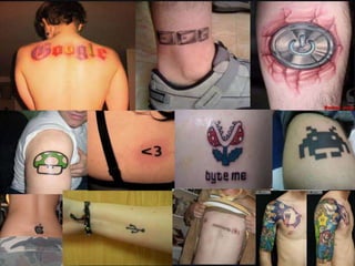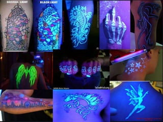 Un tatuaje es una herida punzante en la dermis, la segunda capa más profunda de la piel, que se llena con tinta para crear un diseño permanente. Los tatuajes se originaron hace miles de años aunque no se conoce exactamente cuándo o cómo se descubrió el proceso. Existen muchos estilos de tatuajes incluyendo tatuajes góticos, orientales, de ilusión óptica, ultravioletas, humorísticos, frikis, textuales y tribales. Los tatuajes conllevan riesgos de infección