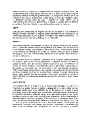 El documento proporciona información sobre la historia y cultura del tatuaje alrededor del mundo. Se han encontrado las evidencias más antiguas de tatuajes en momias datadas en el año 2000 a.C. en Chile. Culturas como la polinesia, Egipto, América y el Lejano Oriente han utilizado el tatuaje con fines estéticos, rituales y de identificación por miles de años. En la actualidad, el tatuaje se practica globalmente con propósitos principalmente artísticos y de expresión personal.