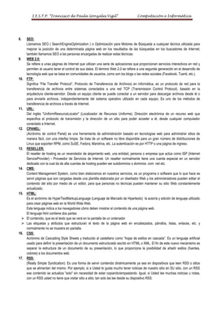 1. El documento define varios términos clave relacionados con internet y el desarrollo web como dominio, subdominio, hosting, Whois, DNS, IIS, Apache, SEO, Web 2.0, FTP, URL, cPanel, reseller, CMS, HTML, CSS, RSS, spam, WYSIWYG, RVSKIN, ASP, PHP, JavaScript, AJAX, XML, link, template, plugin, widget y blog.