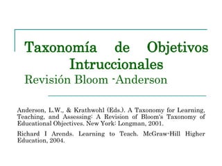 Este documento presenta un resumen de la Taxonomía de Bloom-Anderson, la cual clasifica los objetivos educativos en seis niveles cognitivos crecientes: 1) memorizar, 2) comprender, 3) aplicar, 4) analizar, 5) evaluar y 6) crear. Explica cada nivel y ofrece ejemplos de palabras clave y tareas para cada uno. Además, describe cómo los maestros pueden usar esta taxonomía para escribir objetivos educativos que promuevan diferentes habilidades de pensamiento en los estudiantes.