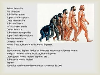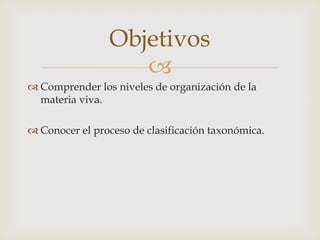 El documento describe los niveles de organización de la materia viva, incluyendo las características de los seres vivos, su organización celular y estructural, metabolismo, homeostasis y otros procesos. También explica la clasificación taxonómica establecida por Linneo y los seis reinos que se aceptan actualmente para clasificar a los seres vivos: Protistas, Arqueobacterias, Eubacterias, Hongos, Plantas y Animales.