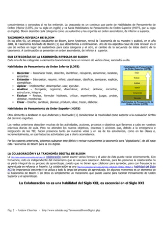 Este documento presenta una actualización de la Taxonomía de Bloom para la era digital. Originalmente desarrollada por Benjamin Bloom en 1956, la taxonomía clasifica los objetivos educativos en seis categorías cognitivas de orden ascendente. En 2001, Lorin Anderson y David Krathwohl realizaron una revisión. Este documento propone actualizarla para reflejar las nuevas tecnologías y formas de aprendizaje digital, centrándose no solo en lo cognitivo sino también en herramientas, métodos y colaboración.