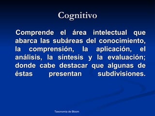 La taxonomía de Bloom clasifica los objetivos educativos en tres dominios: cognitivo, afectivo y psicomotor. El dominio cognitivo incluye procesar información, conocimiento y habilidades mentales. El dominio afectivo incluye actitudes y sentimientos. El dominio psicomotor incluye habilidades manipulativas, manuales o físicas.