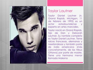 Este documento presenta información biográfica sobre el actor estadounidense Taylor Lautner. Detalla que nació en 1992 en Michigan y practicó karate desde los 6 hasta los 13 años, ganando campeonatos. Comenzó su carrera como actor en 2001 y tuvo papeles en películas como Sharkboy y Lavagirl en 3D y la saga Crepúsculo, donde interpretó a Jacob Black. El documento también incluye una tabla con la filmografía de Lautner.
