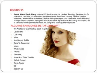 Taylor Swift nació en 1989 en Pensilvania y se mudó a Nashville a los 14 años para perseguir una carrera en la música country. Firmó con Big Machine Records y se convirtió en la cantautora más joven contratada por Sony/ATV Music. Algunas de sus canciones más populares incluyen "Love Story", "You Belong With Me", "Blank Space" y "Shake It Off".