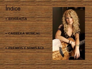 Taylor Swift es una cantante estadounidense de country y pop. Comenzó a escribir canciones y cantar a los 10 años. Firmó un contrato discográfico con Big Machine Records después de actuar en un concurso. Ha lanzado tres álbumes de estudio - Taylor Swift, Fearless y Speak Now - que han tenido gran éxito comercial y crítico. Ha recibido numerosas nominaciones y premios como los Grammy y los American Music Awards.