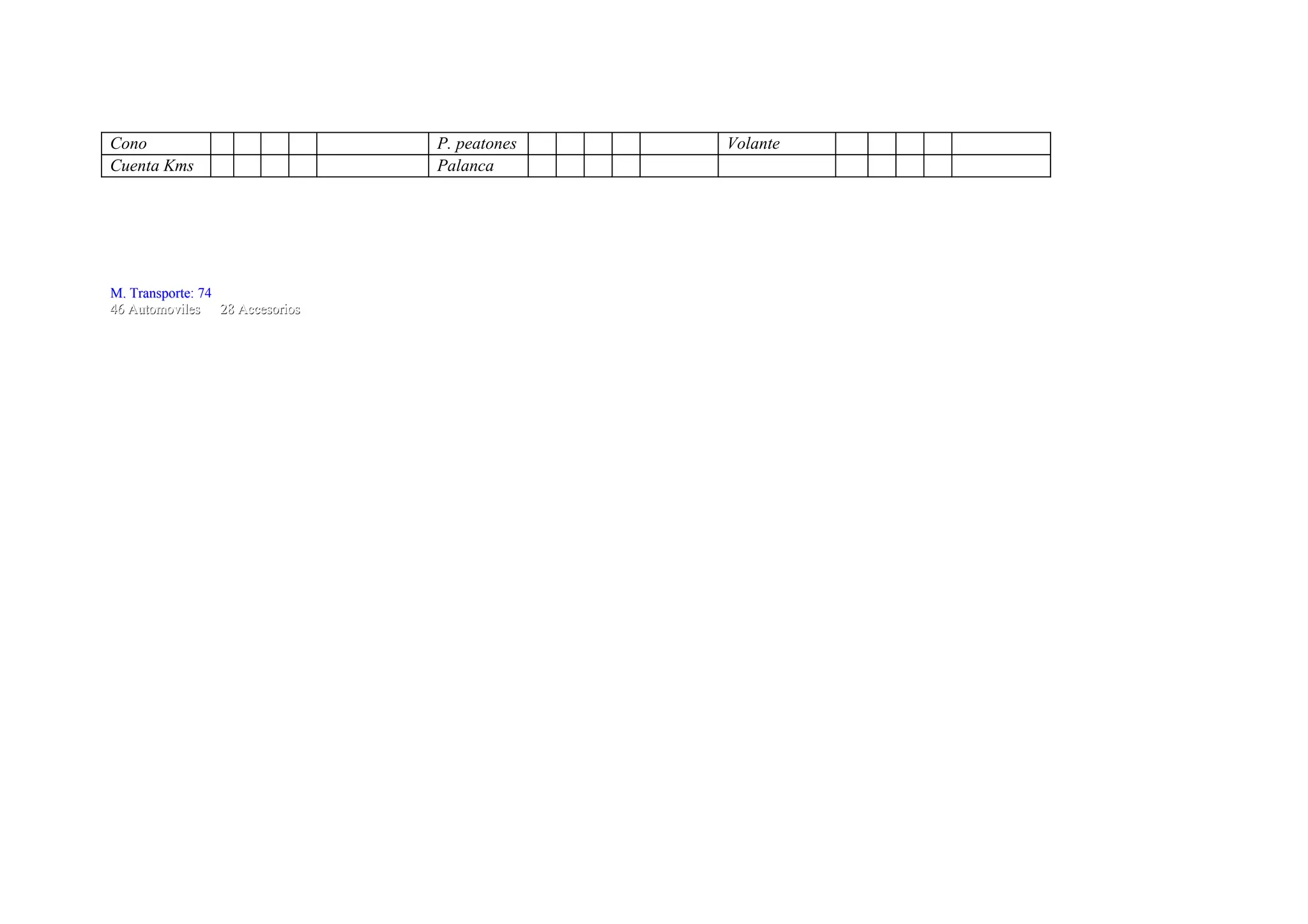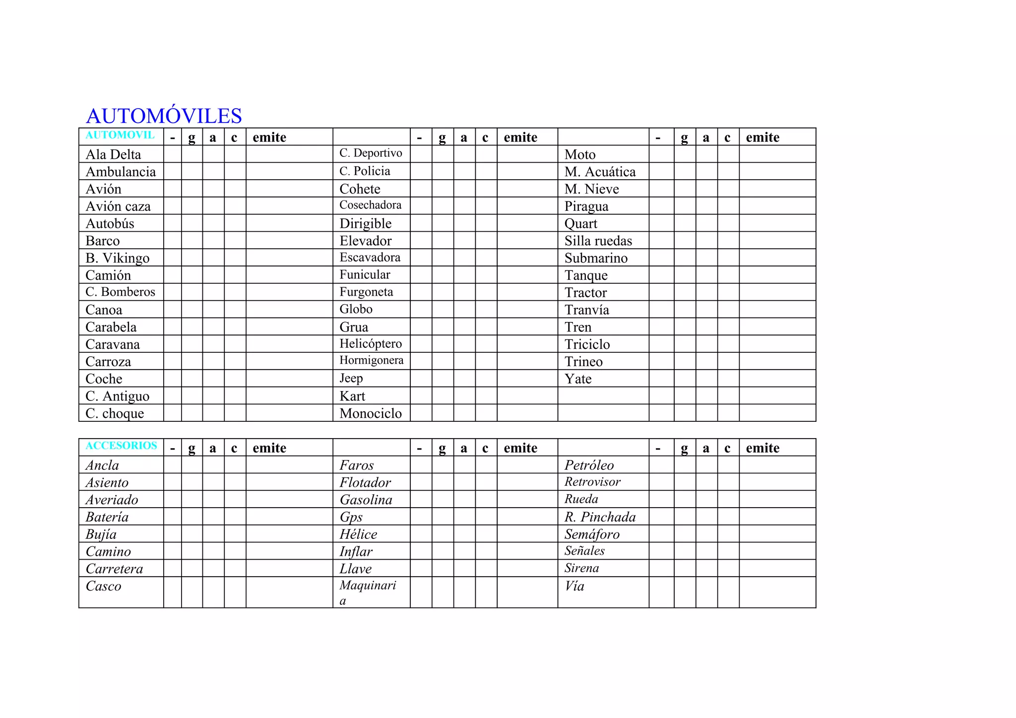 El documento lista 74 tipos de vehículos y medios de transporte, incluyendo automóviles, barcos, aeronaves y más. También enumera 28 accesorios comunes para vehículos como ruedas, gasolina, faros y más. La lista cubre una amplia gama de opciones de transporte terrestre, marítimo y aéreo.