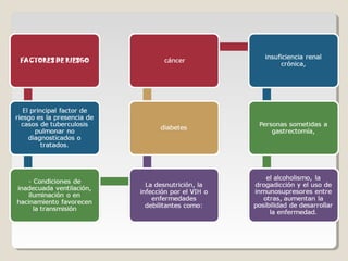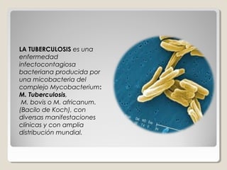 Este documento describe la tuberculosis, una enfermedad infecciosa causada por bacterias del complejo Mycobacterium que afecta principalmente los pulmones. Explica los síntomas, formas de transmisión, periodo de incubación, reservorios, diagnóstico y tratamiento de la tuberculosis. También provee detalles sobre la clasificación de casos de tuberculosis pulmonar, meníngea y otras formas extrapulmonares.