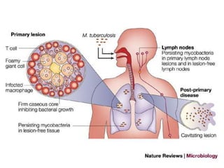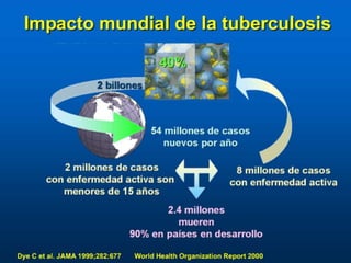 La tuberculosis sigue siendo un problema de salud pública, especialmente en niños donde las pruebas suelen ser negativas. La tuberculosis en niños puede presentarse de forma diseminada y los síntomas comunes son fiebre y pérdida de peso. El diagnóstico se basa en criterios clínicos, epidemiológicos y pruebas como radiografías, prueba tuberculínica e histopatología. El tratamiento consiste usualmente en una combinación de isoniazida, rifampicina, pirazinamida y etambutol.