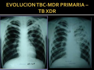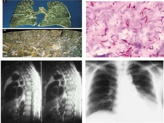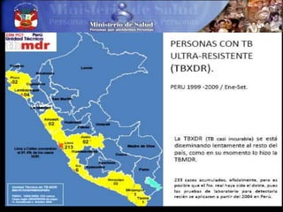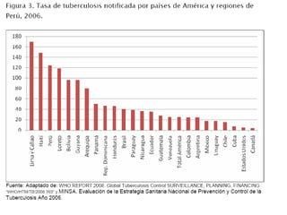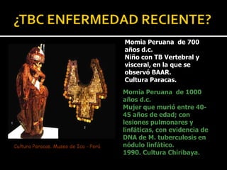 El documento describe la tuberculosis en momias peruanas antiguas que datan de entre 700 y 1000 d.C., encontrando evidencia de infección por Mycobacterium tuberculosis. También resume la epidemiología, síntomas, formas, detección, diagnóstico y tratamiento de la tuberculosis en el Perú.