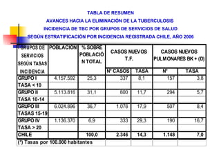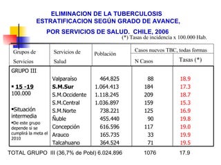 1) El documento presenta datos sobre la incidencia de tuberculosis (TBC) en Chile en 2006, estratificada por grupos de servicios de salud. 2) Se identifican tres grupos, siendo el Grupo III el de mayor riesgo de no cumplir la meta de eliminación para 2010. 3) Dentro de este grupo, la población entre 15-19 años es clave para determinar si se alcanzará dicha meta.