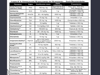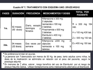 El documento presenta un esquema de tratamiento para la tuberculosis que incluye información sobre la epidemiología mundial de la enfermedad, factores de riesgo, principios básicos del tratamiento, fármacos antituberculosos de primera y segunda línea, y esquemas de tratamiento estándar, para tuberculosis multirresistente y extensamente resistente.