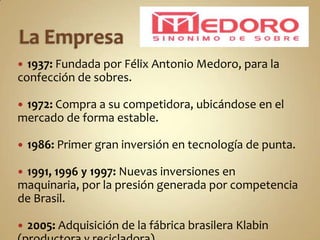La empresa, fundada en 1937 por Félix Antonio Medoro, se especializa en la confección de sobres y ha realizado importantes inversiones tecnológicas para mantenerse competitiva en el mercado sudamericano. Actualmente, cuenta con una amplia variedad de productos y un 60% de participación de mercado, además de un fuerte enfoque en sostenibilidad y alianzas estratégicas, aunque enfrenta desafíos como problemas energéticos y presión sindical. Su misión es consolidarse como líder en la venta de productos derivados del papel en América.