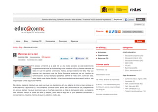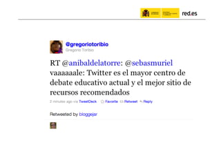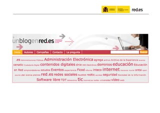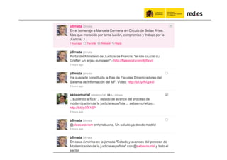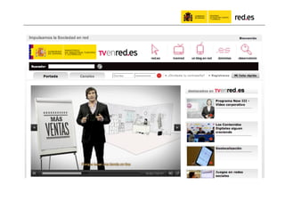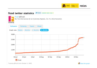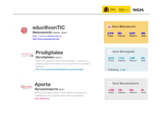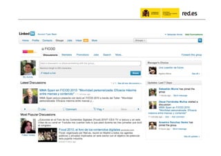 El documento habla sobre el uso de las redes sociales por parte de la administración pública. Resalta los beneficios de compartir información en línea, incluyendo obtener más retroalimentación y estar presente donde la gente ya conversa. Proporciona ejemplos como #ficod, la cuenta de Twitter de red.es, y proyectos educativos en línea dirigidos a docentes. Argumenta que aunque las redes sociales son útiles, también es importante comunicarse por otros medios cuando el público objetivo no usa redes sociales.