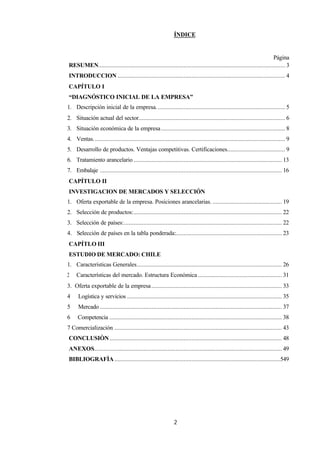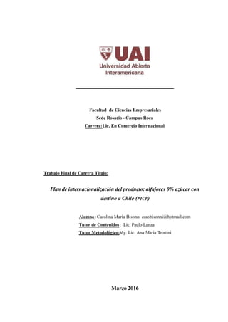 Este documento presenta un plan de internacionalización del producto alfajor integral 0% azúcar de la empresa Alimentos Tahona SRL con destino a Chile. Tras un diagnóstico de la situación actual de la empresa y del sector de alimentos saludables, se realiza una investigación de mercados para seleccionar Chile como mercado objetivo. Finalmente, se estudia en detalle el mercado chileno, incluyendo características económicas y del sector, competidores, y un plan de comercialización para los alfajores en ese país.