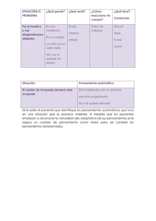 La terapia cognitivo conductual ayuda a entender problemas complejos desglosándolos en partes más pequeñas para ver cómo las partes están conectadas y cómo se afectan mutuamente, incluyendo problemas, pensamientos, emociones, sensaciones físicas y comportamientos. Cada una de estas áreas puede afectar a las demás, por lo que los pensamientos sobre un problema pueden afectar los sentimientos y acciones de una persona.