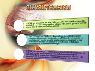 El traumatismo craneoencefálico (TCE) es una de las principales causas de muerte entre la población pediátrica y adulta joven en países industrializados. Los vehículos a motor son la primera causa de TCE en personas jóvenes. El TCE puede causar daño primario como fracturas de cráneo o contusiones, y daño secundario como edema cerebral o hemorragia intracraneal. El diagnóstico y tratamiento del TCE busca reducir el riesgo de lesiones secundarias.