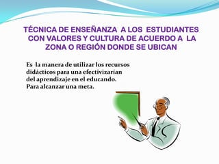 Este documento describe diferentes técnicas de enseñanza que se pueden utilizar para enseñar a los estudiantes de acuerdo con los valores y la cultura de la zona donde se encuentran. Describe técnicas como la enseñanza individualizada, la enseñanza socializada, la exposición oral, el dictado, el interrogatorio, la argumentación y el diálogo. La meta es lograr que los estudiantes aprendan de manera efectiva y se integren en la sociedad de acuerdo a su región.