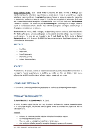 Este documento describe varias técnicas mixtas en las artes plásticas, incluyendo la combinación de ceras o pasteles al óleo con acuarela, grafito y tinta, y fotocollage. Explica que artistas como Paul Klee y Max Ernst utilizaron técnicas mixtas en el siglo XX y que los dadaístas y surrealistas desarrollaron el collage. También proporciona detalles sobre procedimientos específicos como la resistencia a la cera y la decalcomanía.