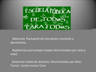 El documento presenta estadísticas de matrícula escolar de los años 2010 a 2012, incluyendo la matrícula fluctuante y los porcentajes de repitencia discriminados por sexo y edad. También muestra la asistencia media de los alumnos discriminada por año, turno, contra turno y ciclo.